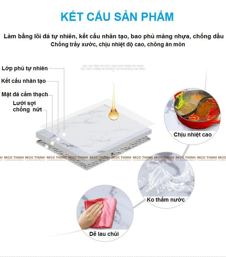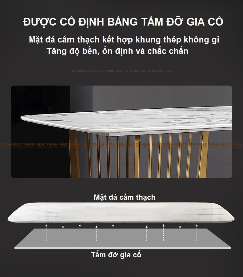 Mặt bàn được làm từ đá marble ( đá cẩm thạch), loại đá được mệnh danh là vua của các loại đá tự nhiên có thể chế tác, vẻ đẹp của đá marble luôn có một sức hút đặc biệt khiến người sử dụng cảm thấy thoải mái, dễ chịu khi được sử dụng. Bên cạnh đó còn tăng được tính thẩm mỹ trong không gian phòng ăn khiến những vị khách đến chơi trầm trồ về sự tinh tế của gia chủ.