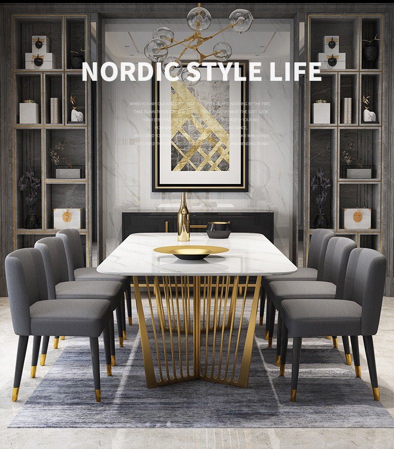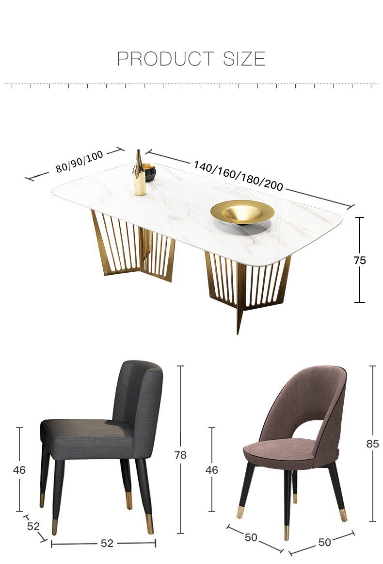 Bàn ăn mặt đá cao cấp PS703 nhập khẩu 100% với kiểu dáng sang trọng, chân và khung inox mạ vàng. Mặt đá hình chữ nhật bo tròn góc các cạnh vô cùng sang trọng kết hợp với đường vân đá tự nhiên của mặt bàn tạo điểm nhấn cho chiếc bàn phá cách, hiện đại hơn