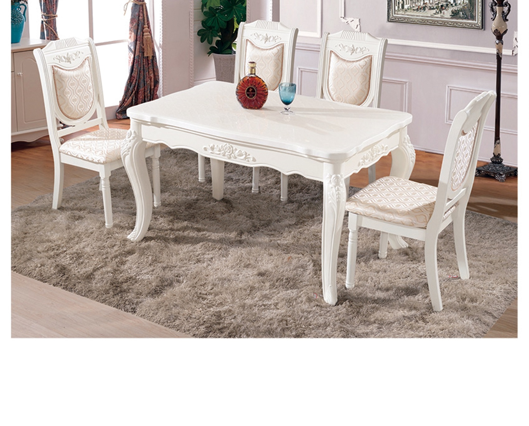 Nội Thất Mộc Thịnh xin giới thiệu đến các bạn Bộ Bàn Ăn Mặt Đá cao cấp nhập khẩu Mã số F98 nhập khẩu100% từ nước ngoài với kiểu dáng sang trọng với chất liệu gỗ cao su tự nhiên, chân và khung bàn sơn màu trắng. Bộ Bàn Ăn Mặt Đá cao cấp nhập khẩu Mặt đá sang trọng với hoa văn sinh động tạo điểm nhấn cho chiếc bàn ăn phong cách hiện đại và phá cách. Những chiếc ghế cũng được làm bằng gỗ cao su cứng cáp, mặt tựa lưng ghế uốn theo chiều lưng của người ngồi, nên khi ngồi tạo cho người ngồi cảm giác thoải mái và dễ chịu.