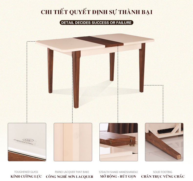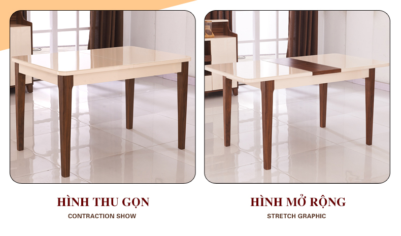 - Mặt kính màu kem trắng hiện đại và bắt mắt. Bàn ăn có thể mở rộng và thu gọn lại dễ dàng nhờ bộ phụ kiện cao cấp. Khi thu gọn mặt bàn có kích thước 1m2 có thể ngồi được 4 người, khi mở rộng và kích thước mặt bàn là 1m5 có thể ngồi được 6 người, Bộ bàn ăn nhập khẩu C133 rất thích hợp cho những không gian nhà chung cư và những căn hộ có diện tích vừa phải. Thời buổi tấc đất tấc vàng nên tiết kiệm không gian là tiết kiệm chi phí khôn ngoan, Bộ bàn ăn nhập khẩu C133 sẽ là sự lựa chọn hoàn hảo cho ngôi nhà bạn