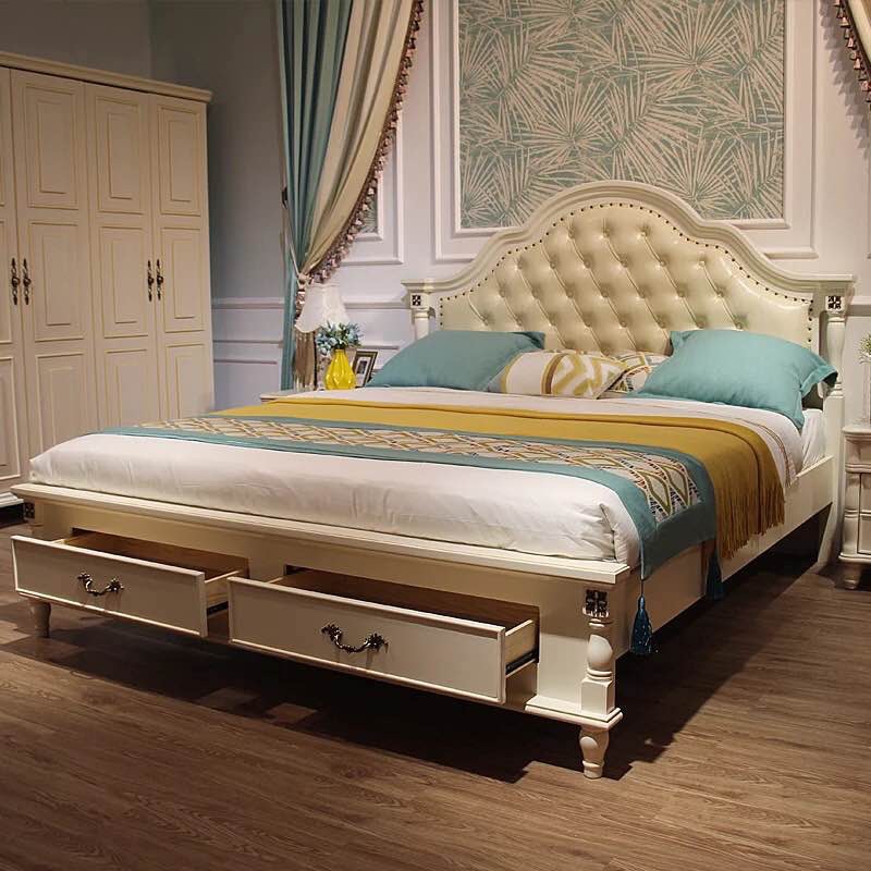 - Giường ngủ với điểm nhấn đầu giường bọc nệm da màu kem, giật khuy nhám đính đá sang trọng, thiết kế thân thiện với không gian phòng ngủ của người Việt. Phong cách nội thất Mỹ với những đường nét nghệ thuật tạo cho bạn sự bắt mắt. Thiết kế tạo sự khác biệt với 2 ngăn kéo trượt cuối giường thuận tiện để những vật dụng cần thiết. 4 chân trụ hình tròn có chiều cao hợp lý giúp bạn dễ dàng lau dọn sàn nhà sạch sẽ. Mẫu giường ngủ cao cấp được gia công cẩn thận bề mặt trơn, bóng làm tăng tính thẩm mỹ của chiếc giường.