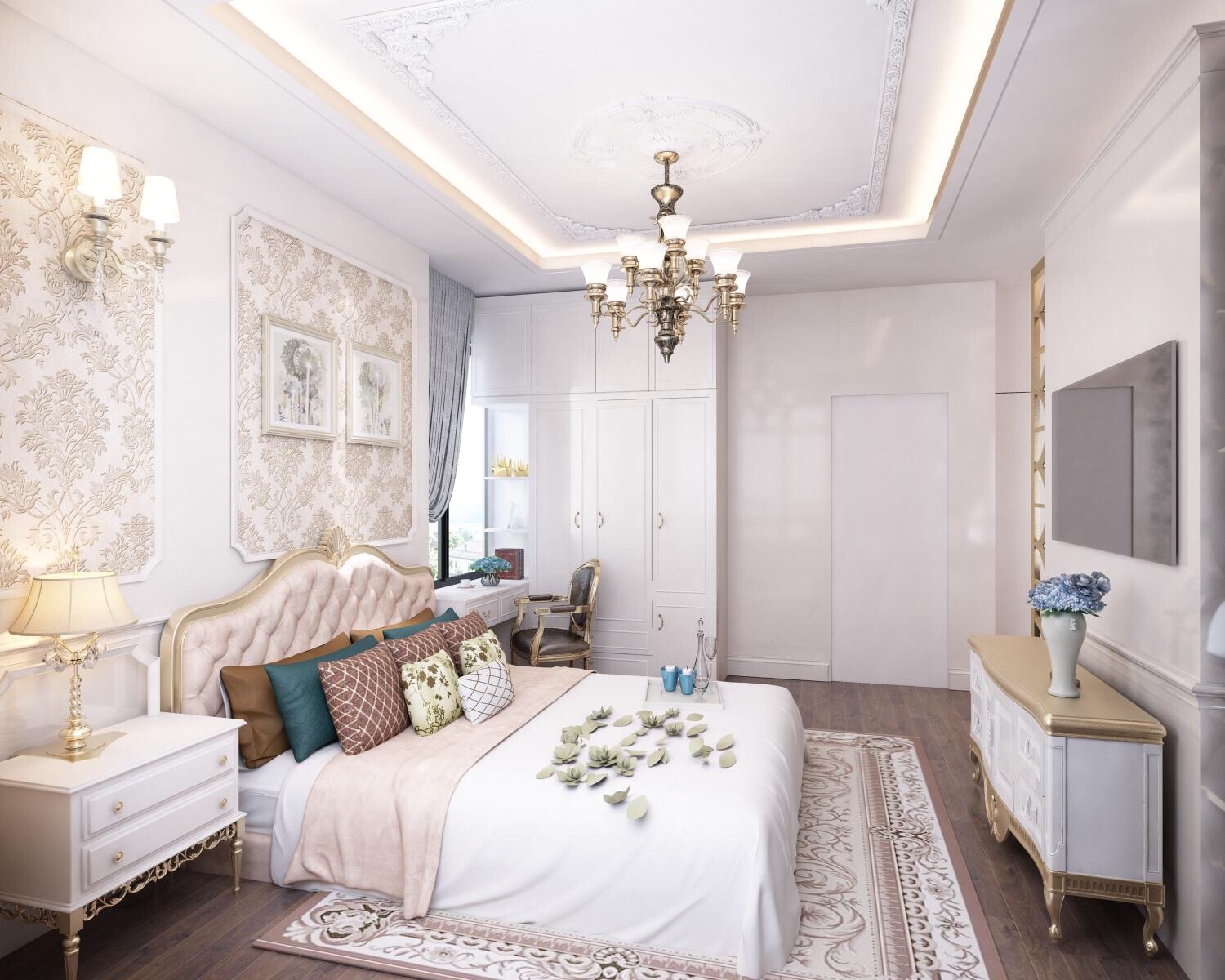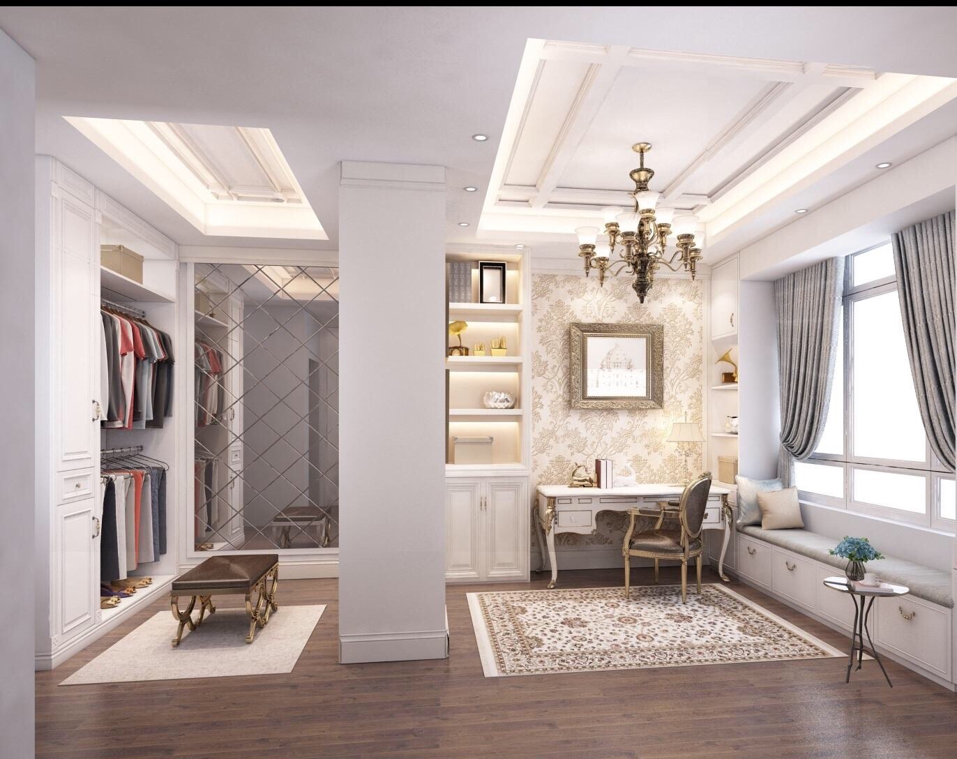 Thiết kế nội thất phòng ngủ master với đồ nội thất tân cổ điển chủ yếu được làm từ chất liệu gỗ công nghiệp cao cấp. Cách bố trí nội thất phòng ngủ khoa học và tinh tế mang lại không gian nghỉ ngơi lý tưởng, không gian thay đồ sang trọng và không gian làm việc tách biệt.