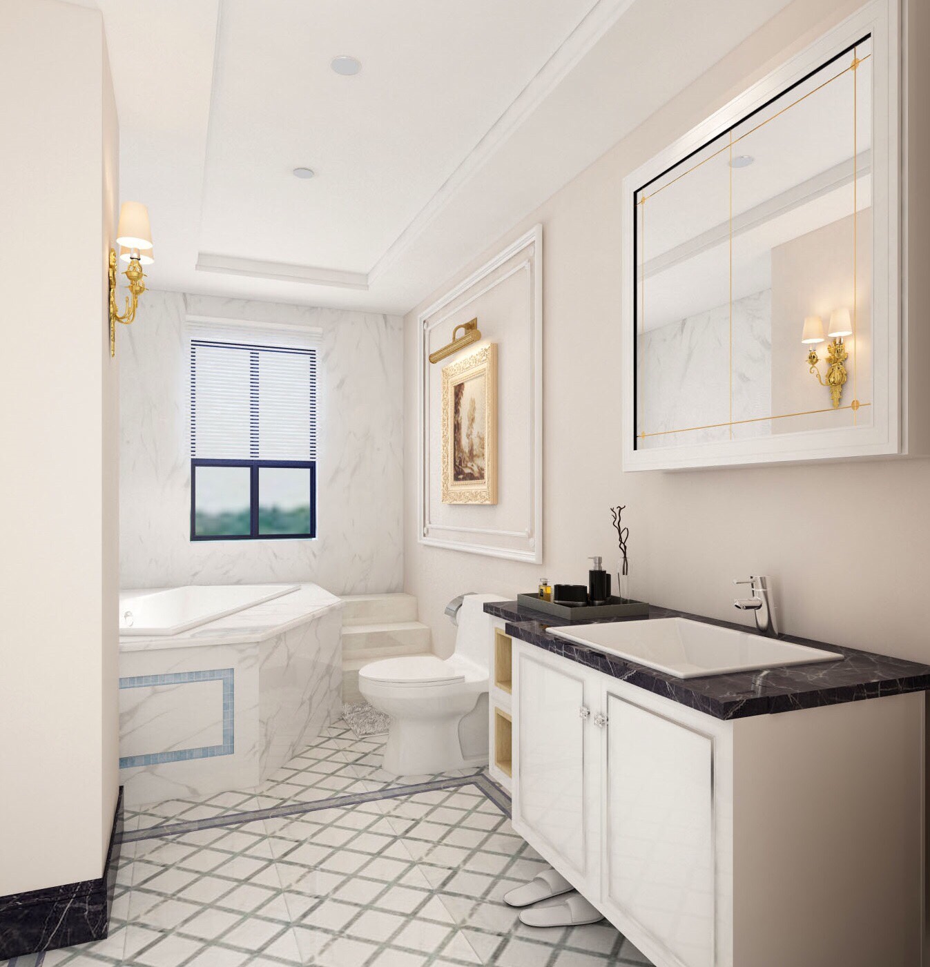 Không gian phòng tắm, ngoài việc phục vụ nhu cầu sử dụng hàng ngày của gia đình thì những đồ nội thất tân cổ điển này còn giúp tăng chiều sâu cho căn phòng một cách hiệu quả.