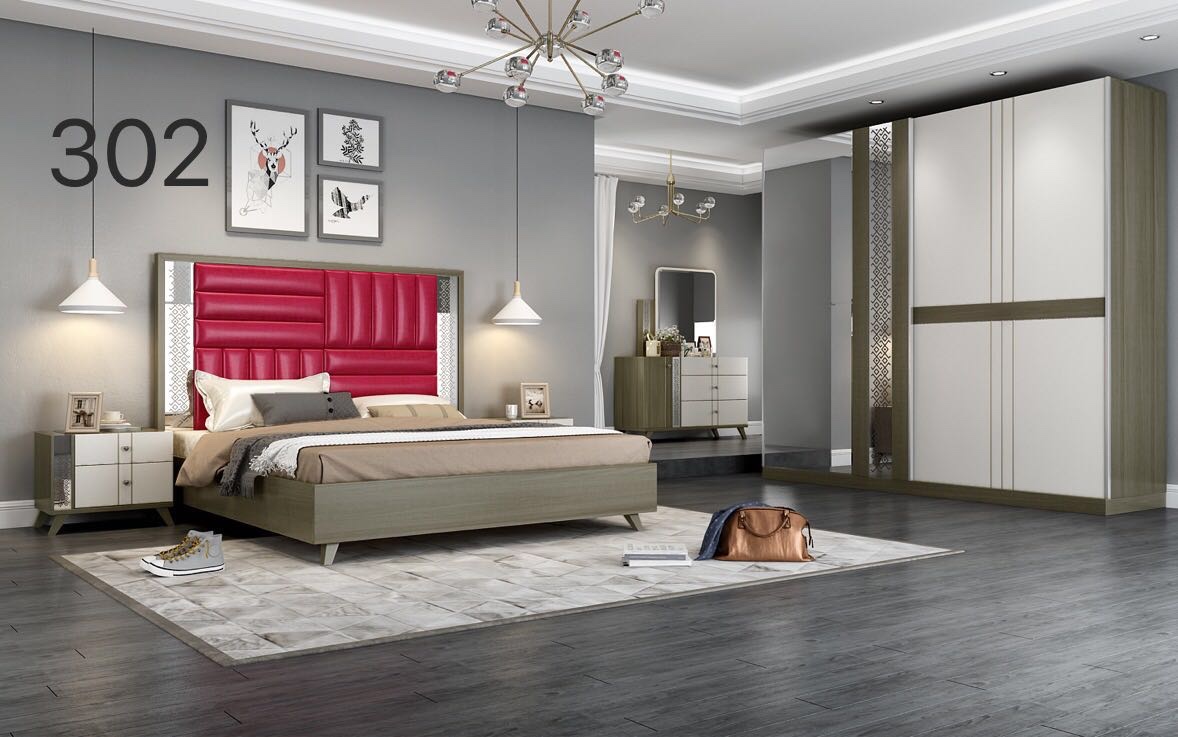 - Mẫu set giường tủ hiện đại 302 với 3 gam màu hòa hợp, trắng, ghi xám, và nổi bật với màu đỏ của giường bọc nệm.