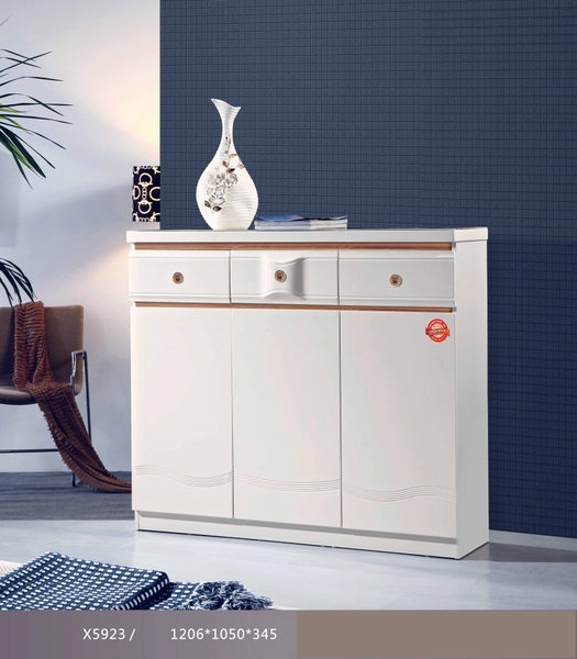 - Tủ giày được trang bị thêm ba ngăn kéo phía trên, giúp người dùng có một không gian đựng giày dép thoải mái theo từng loại, dễ dàng cho việc sử dụng. Bạn cũng có thể tận dụng phần trên của tủ để đặt những phụ kiện trang trí nhà xinh xắn, làm nổi bật thêm cho chiếc tủ nói riêng và tăng thêm sự ấn tượng cho căn phòng nói chung. Hãy thể hiện sự sáng tạo và gu thẩm mỹ của mình qua cách trang trí phòng khách thật khéo léo nhé!